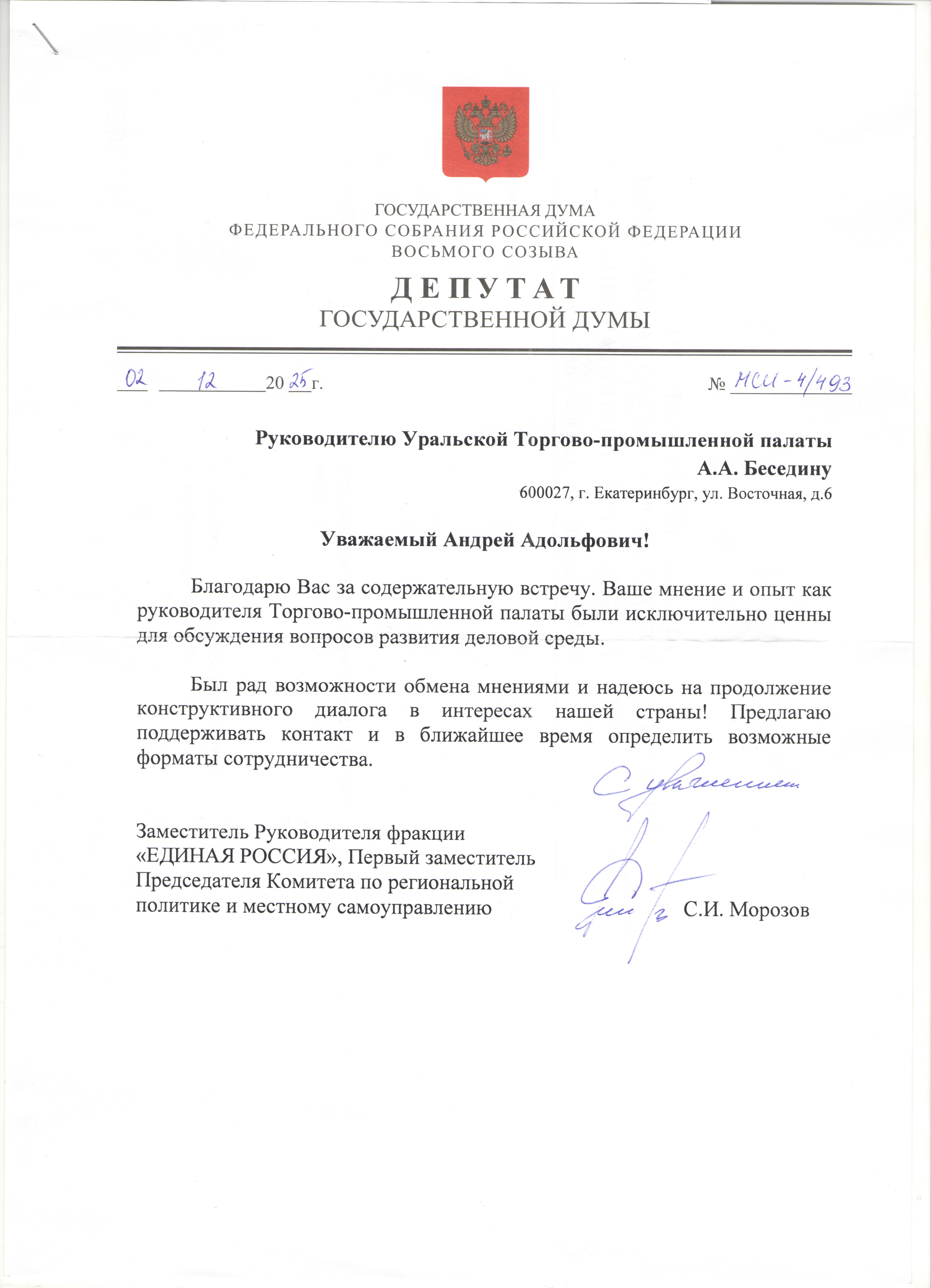 Еще раз благодарим Вас и Уральскую торгово-промышленную палату за доверие и поддержку.