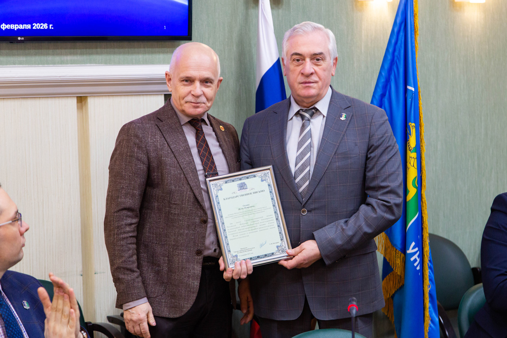 Перед началом заседания Андрей Беседин вручил и.о. ректора УрГЭУ Якову Силину благодарственное письмо президента Уральской торгово-промышленной палаты Российской Федерации за содействие в развитии системы региональных торгово-промышленных палат.